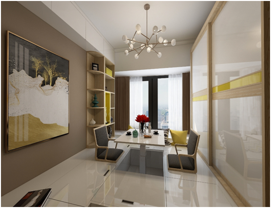 房间配色加入了活跃的明黄色,与米黄基底色渲染出了一个明快的环境,可作孩子的卧室+小书房。