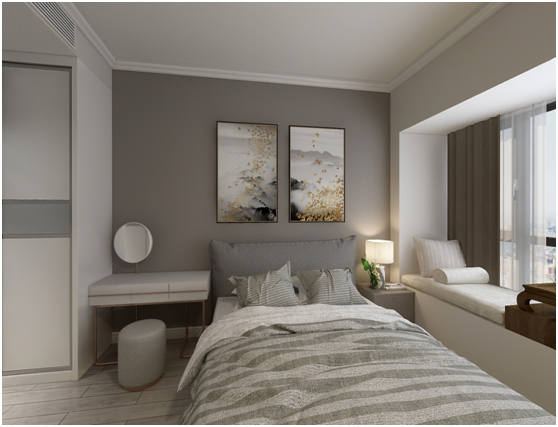 卧室的布置和色调依据业主的喜好,偏于素净淡雅。白色的天花和原木地板之间,增加了温和低调的灰色进行渲染,氛围更趋沉稳舒适。