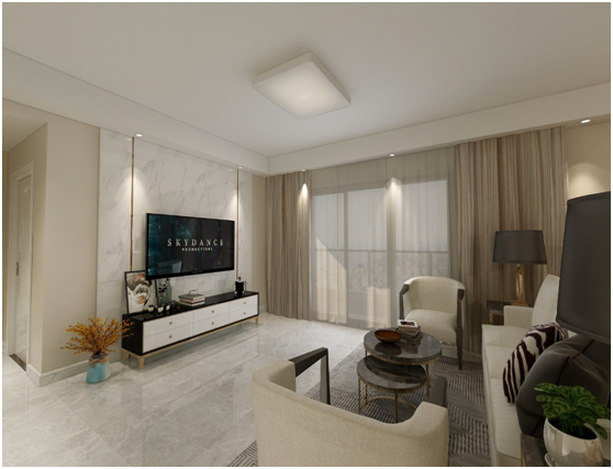 沙发背靠餐厅,以对称合围式布局,自然形成客厅区域。客厅直通阳台,以玻璃推拉门隔断,保证了充足的采光和通风。