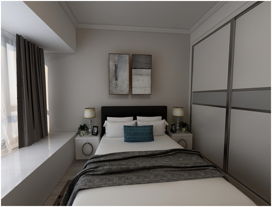 装饰亦是朴素且清爽,顶天立地柜,配以隐形推拉门,既能防尘又节省了空间。小巧精致的床头柜分置两边,美观实用。