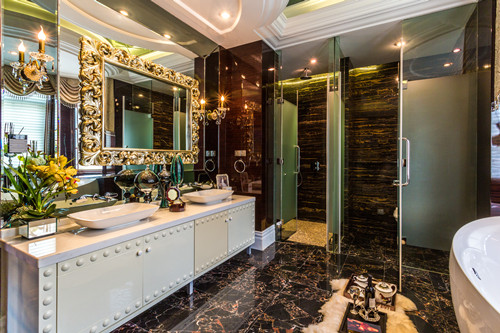 2、 灯光。由于卫生间的空间相对较小,采用的灯光不必太亮,因此使用的灯具要与客厅的吸顶灯相区分。一般来说,要具备浴霸类的制热灯具,或者在镜子前面安装木质类的装饰灯具,也可以考虑陶瓷玻璃材质的,而镜子的框架用木雕或边框比较合适。