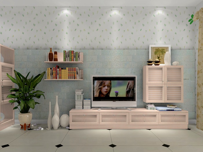 4、小面积的背景墙是很多户型,电视背景墙其实它并不是一整面墙。可以通过电视柜增加一些储物柜子的颜色,最好可以根据相关的背景进行搭配。