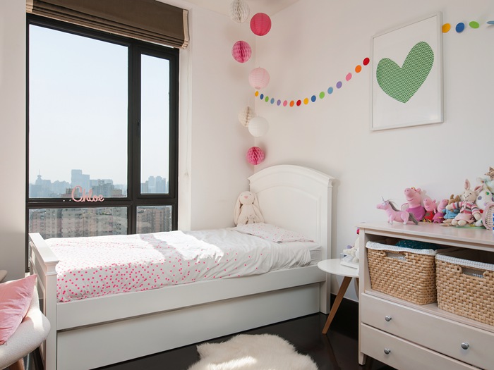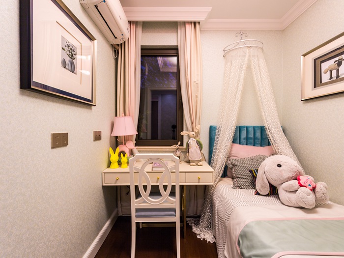 其次,做个储物柜。靠近窗户边可以增加一个储物柜,以玻璃镶嵌,打造成储物书柜、杂物柜。飘窗台延伸设计,直接做办公区域设计,然后把空间部分空出来,留一点活动空间。床靠近内墙设计,既节省空间,也能减少外部风吹雨打的噪音,对睡眠质量造成影响。