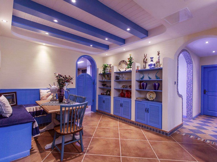 4、地中海风格:作为在特点上,很容易让人看出来的风格,有些小户型也会利用起来,打造梦幻的、浪漫的居住环境。地中海式风格的主色调,多为蓝色、白色,其中有标志的装饰特色,则是拱形门窗。