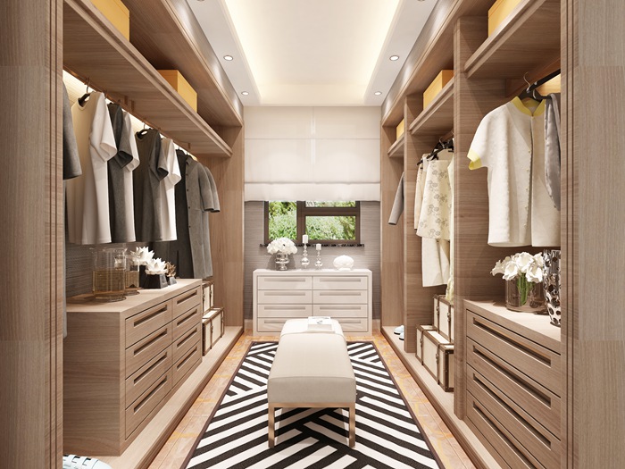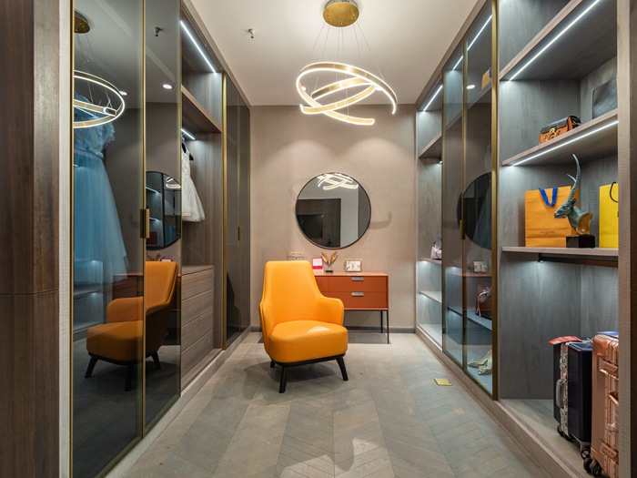 2、独立式:如果房屋户型较大,则可以考虑设计单独的衣帽间,这样就不用担忧灰尘了,也会有更加充裕的使用空间。不过,这样的房间对于照明上的要求,会变得更高一些,需要跟自然的光源接近。