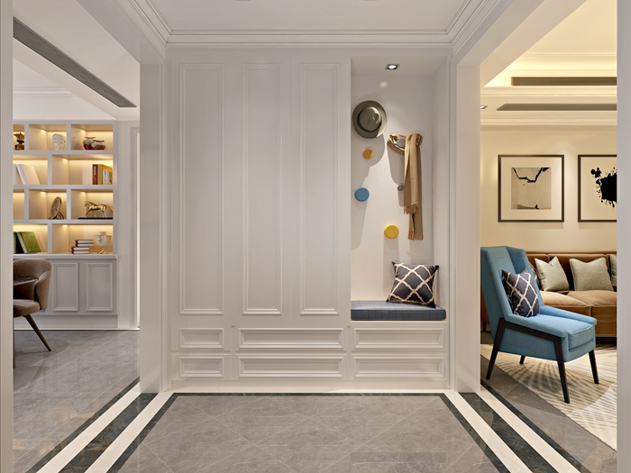 4、玄关处很多都是靠着墙来设置的,让人有大概的印象,清爽水,湖蓝,浪漫,粉紫,缤纷的色彩暗示着室内的主色调,玄关的墙面一般是中性偏暖色,让人体味到家的温暖,感觉到家的包容。